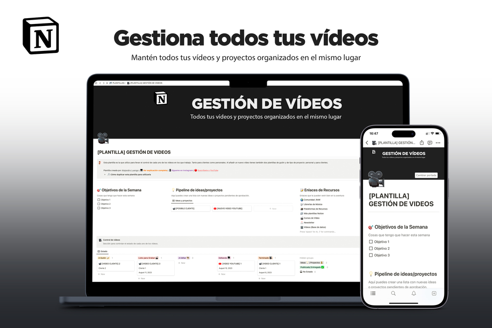 La plantilla de gestión de vídeos es una plantilla para Notion que te va a permitir gestionar todos tus vídeos tanto de clientes como personales.
