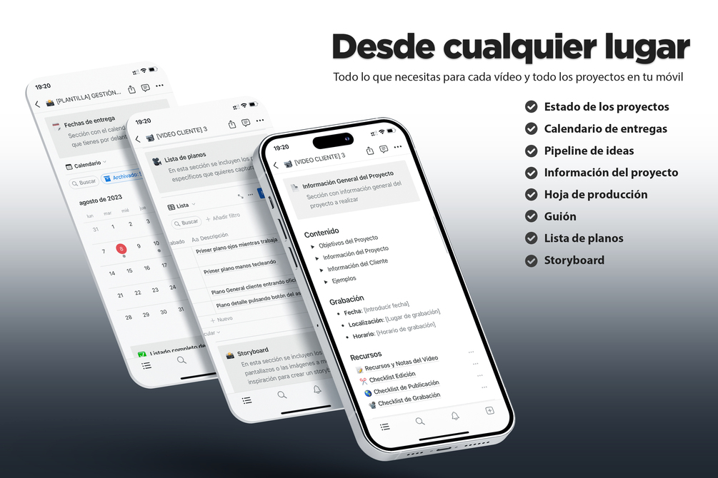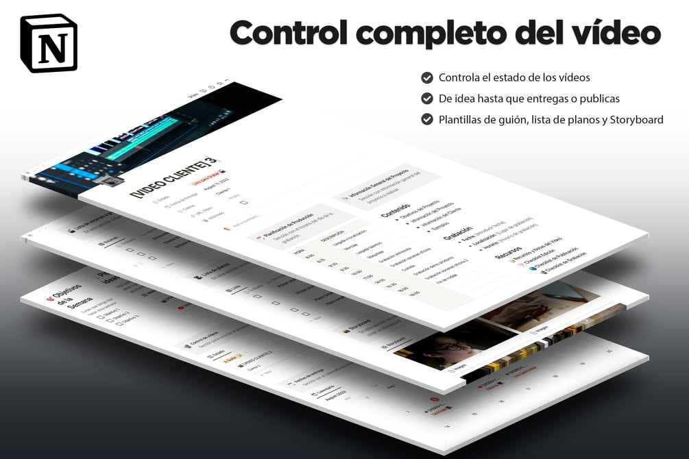Una plantilla de Notion para gestionar tus vídeos personales y de clientes. Con estado del vídeo, fechas, plantilla de guión, lista de planos, storyboard y todo lo que necesitas.